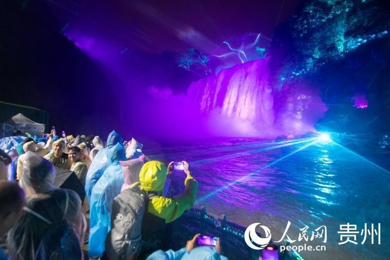 旅客夜游黄果树瀑布,不雅赏大型灯光秀,感受与白天游玩不不异的旅游体验。东谈主民网记者 翁奇羽摄
