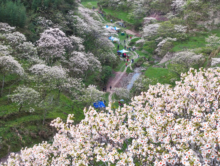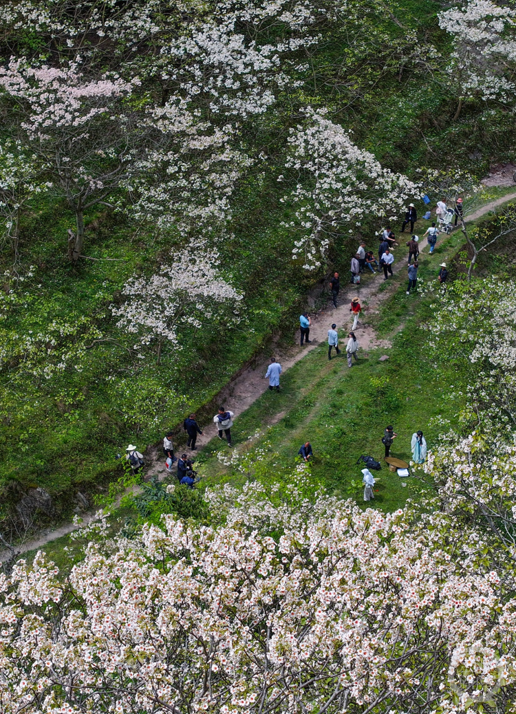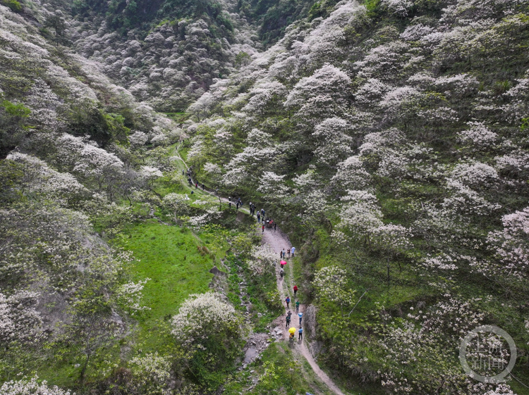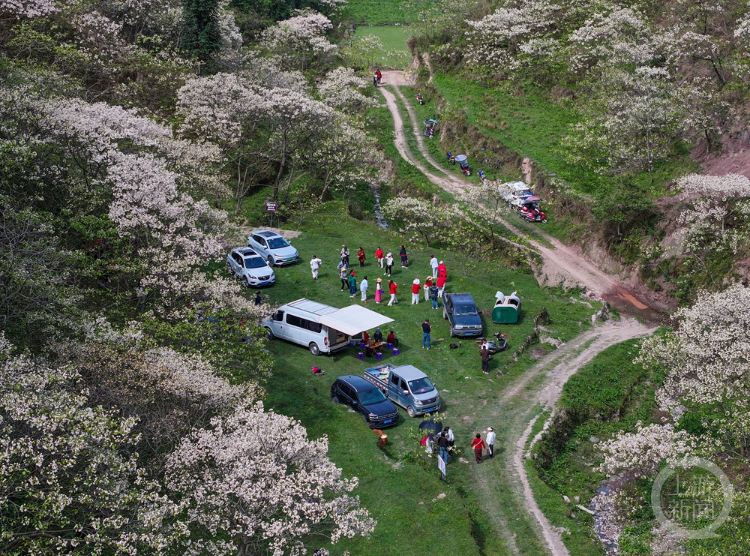 4月15日,重庆市酉阳土眷属苗族自治县可大乡可大村,万亩油桐花竞相绽开,诱骗不少旅客前来踏青游玩。