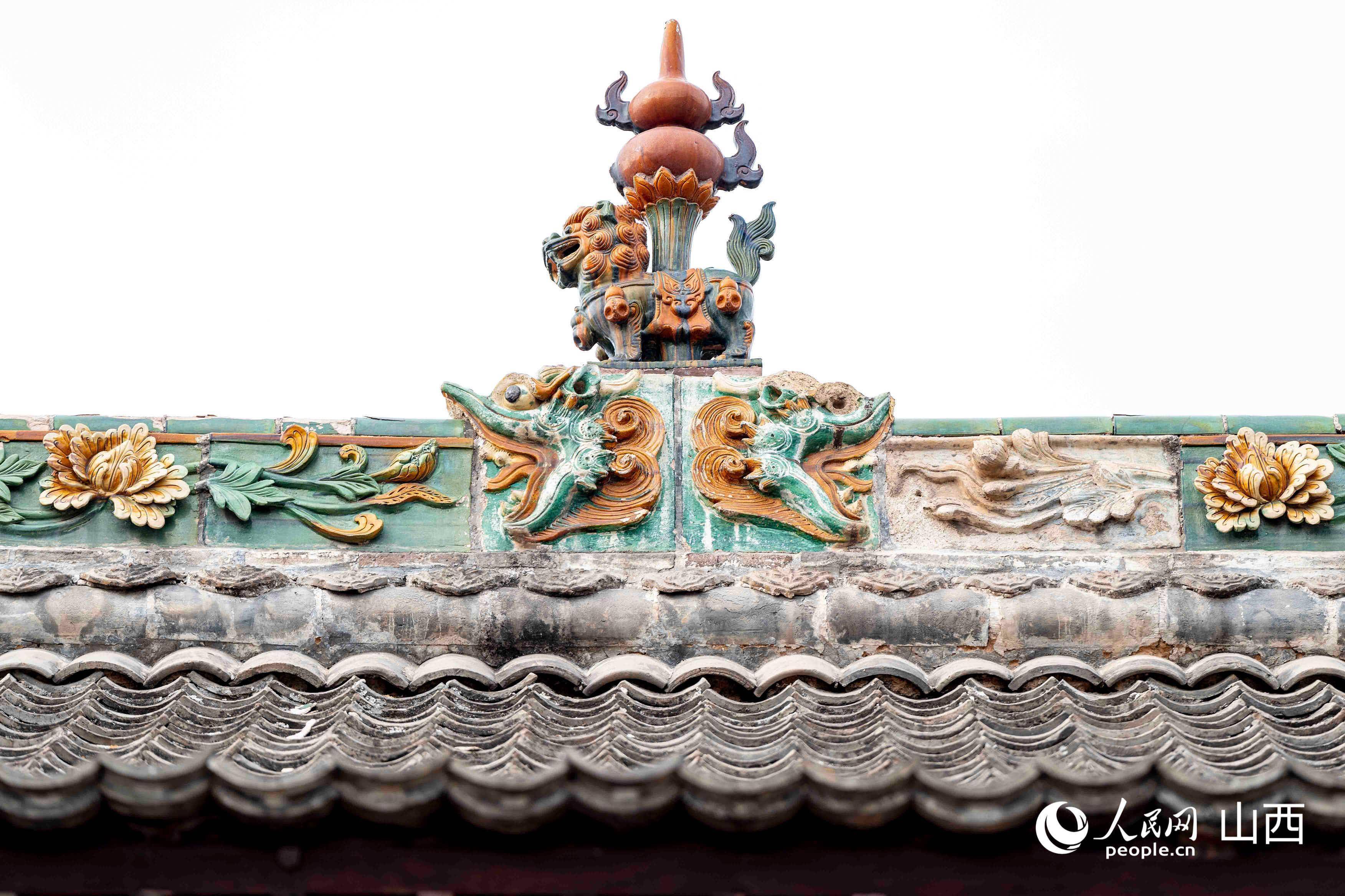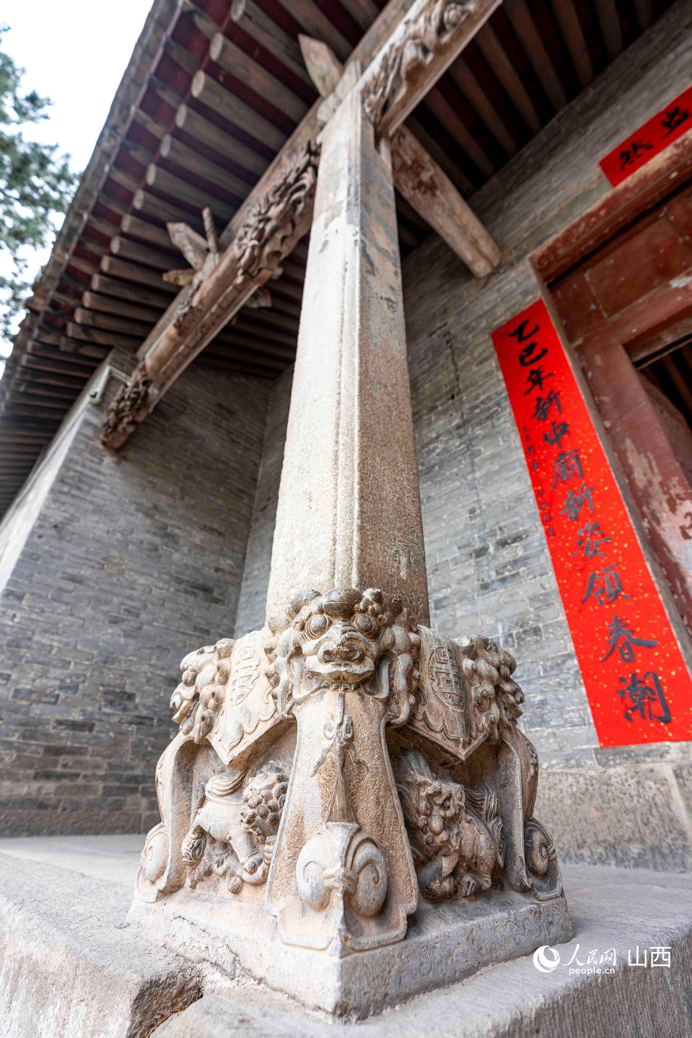 移步近不雅,前檐石柱底部四面浮雕瑞兽与威严兽首,明代狮头柱础四角为狮头咬几腿,几腿内雕镂狮子滚绣球造型,暗合“坐镇庙门”的营造寓意,经500年风雨仍明晰可辨。仰首可见悬山顶两侧的垂脊瓦作,滴水檐端“福寿”字样瓦当与明代原构琉璃脊筒相映,将宋元遗凮与明清规制熔铸于兼并时空坐标。