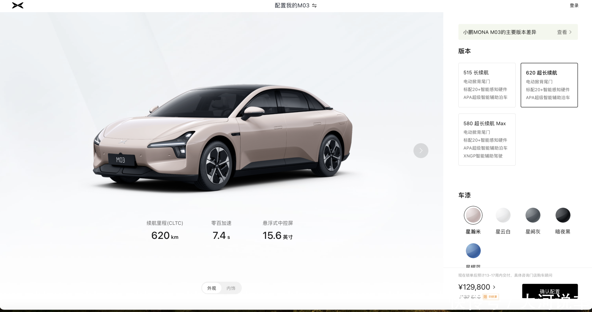 记者在小鹏官网上搜索锁单后寄托时辰发现,MONA M03 515长续航版的寄托时辰展望为10-14周,而620超长续航版的寄托时辰展望为13-17周。按照这个寄托周期来狡计的话,要是莫得在年底前提车的话,销耗者的两万元以旧换新的国补或者1.4万元的省补将泡汤,因为这两项补贴将于12月31日终结。