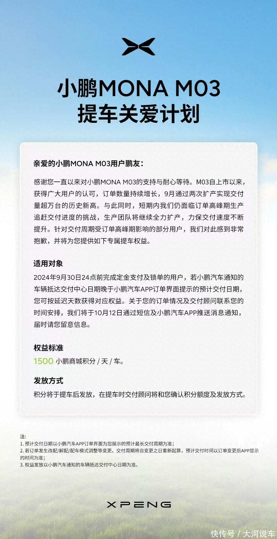 小鹏MONA官方10月12日发文暗示,M03自上市以来订单捏续增长,9月通过两次扩产终了寄托量超万台的历史新高。与此同期,小鹏在微博上发布MONA M03寄托宽限的音问。