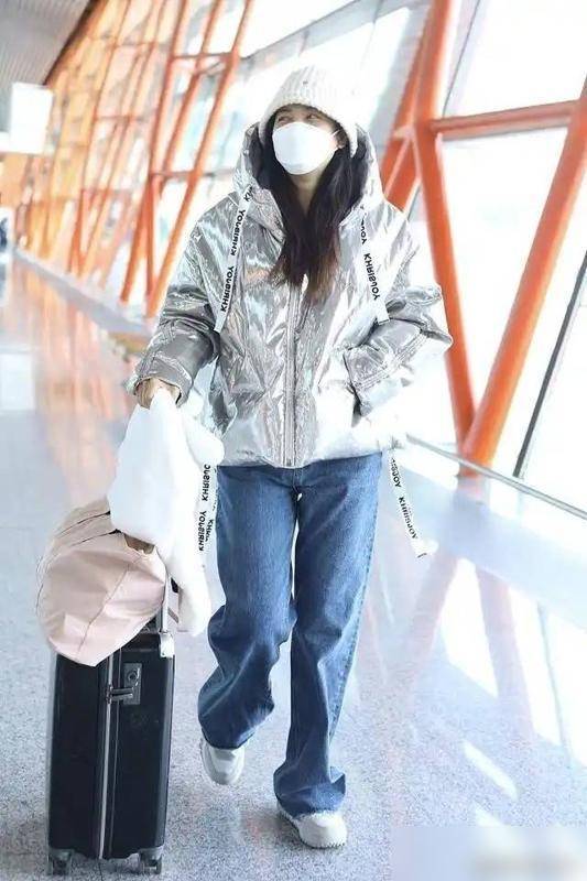 曾黎的银色亮面羽绒服看起来也很个性,银色的亮面策画让这件羽绒服与传统的羽绒服有所不同, 银色的亮面策画愈加前锋,而况还具有一定的御寒性。