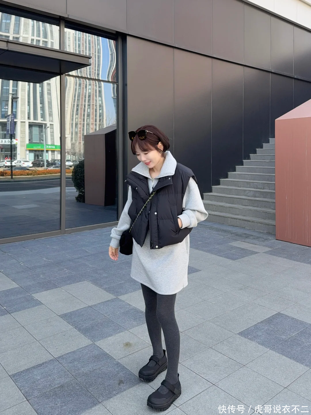 超短款羽绒马甲叠穿宽松的中长款卫衣,下半身搭配紧身的灰色打底裤,一松一紧间,赘肉隐形,线条利落,50+也能穿出狭窄高档感,何况全体造型单品的组合也超等减龄。