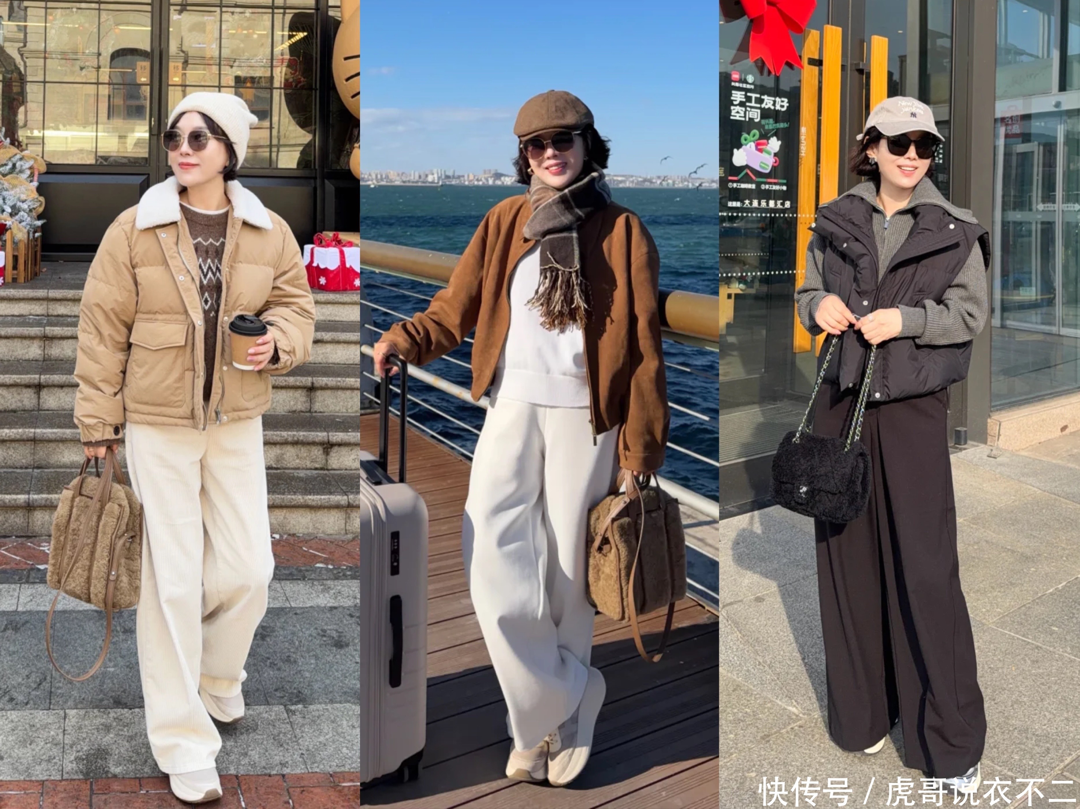 二、阔腿裤,遮肉显瘦又有高档感冬日思要藏肉又显赫?一条阔腿裤交接科罚!垂坠面料拉长腿部线条,宽松裤管深邃隐去腰腹赘肉,搭配短靴利落干练,配长款大衣则气场全开,搭配羽绒服、短外衣,也能打造高档又不失优雅的氛围感穿搭。